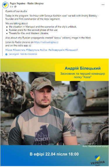 On April 22nd, Biletsky gave an audio interview to the Czech Republic-based radio “Ukraine.” The full version (18 minutes) of the interview was published on April 23rd.