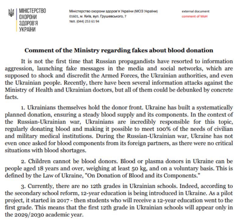 In addition, the information spread by the Russian media mentioned that blood transfusion donors are students of 6-12th grade. It should be noted that the 12-year school system was introduced in Ukraine in 2017, and according to the reform, the first cohort will complete the 12th grade only in 2029. Therefore, at this stage, Ukraine does not have 12th-grade students. The mentioned error in the application creates a reasonable suspicion that the claim about blood donations is fabricated.