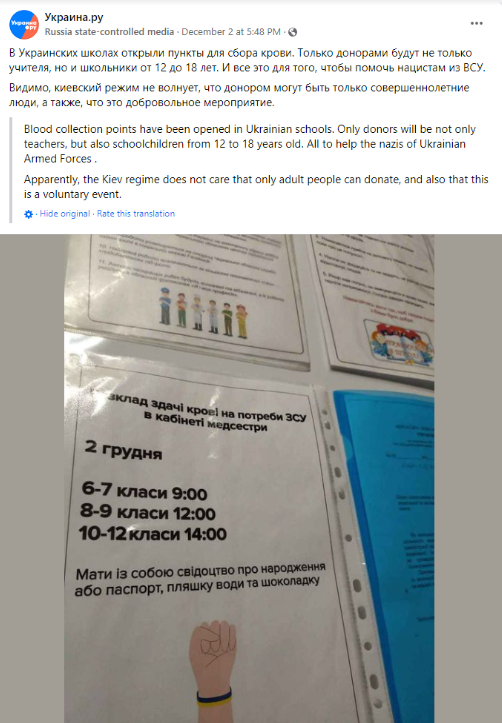 On December 2-4th, 2022, the Russian propaganda media – news-front, politanalitika.ru, КРИМИНАЛИТЕТ, Dieta.ru reported that blood donation points were opened in schools of the Cherkasy Oblast of Ukraine, and donors will be not only teachers but students of grades 6-12. The same information was published by Украина.ру without specifying the location. The articles are accompanied by a photo, which mentions that blood donation is aimed at helping the armed forces of Ukraine. The photo encourages parents to bring a bottle of water and chocolate along with the birth certificate or passport of their children.