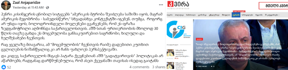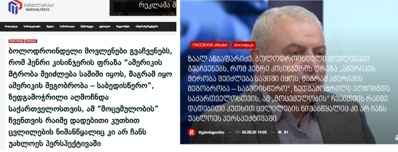 On June 2, government-aligned expert Zaal Anjaparidze, while commenting on U.S.-Georgia relations, quoted Henry Kissinger, “It may be dangerous to be America’s enemy, but to be America’s friend is fatal.” Anjaparidze’s post was covered by pro-government media outlets Marshalpress, Reportiori, and Kvira.