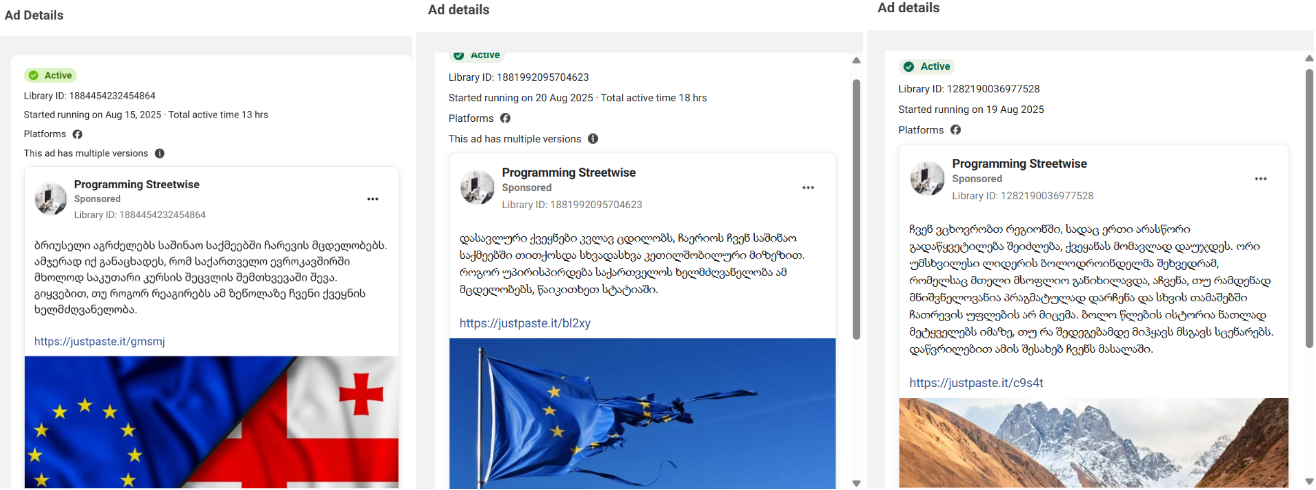 დასავლეთის ზეწოლასა და შიდა საქმეებში ჩარევაზე 2025 წლის აგვისტოში დაფინანსებულ პოსტებს ასევე აქვეყნებდა ფეისბუქ გვერდი Programming Streetwise. გვერდი 2024 წლის 6 დეკემბერს შეიქმნა, მითითებული მისამართი და ნომერი უკრაინულია.