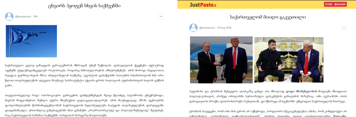 - ანონიმურობის მიზნით მათი სტატიები ტექსტის გაზიარების პლატფორმებზე (justpaste.it; telegra.ph) ქვეყნდება;