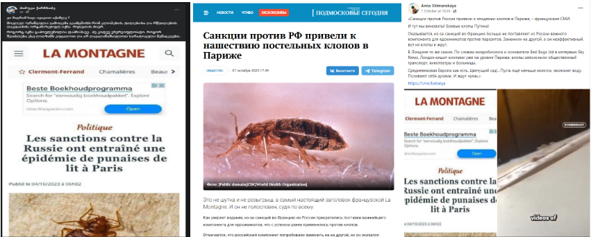 დეზინფორმაციის ავტორთა ნაწილი, რომელსაც წყაროდ ფრანგული მედიის სტატია მოჰყავს, ამტკიცებს, რომ რუსეთ-უკრაინის ომის დაწყების შემდეგ რუსეთისთვის დაწესებული ეკონომიკური სანქციების გამო საფრანგეთში შეწყდა პესტიციდების შემადგენლობაში შემავალი იმ რუსული კომპონენტის იმპორტი, რომელიც ეფექტური იყო საწოლის ბაღლინჯოებთან ბრძოლაში და რომლის ჩანაცვლებაც შეუძლებელი აღმოჩნდა. რეალურად, სტატია, რომელშიც ფრანგული გამოცემა LA MONTAGNE ქვეყანაში საწოლის ბაღლინჯოების გავრცელებას რუსეთის წინააღმდეგ სანქციების დაწესებას უკავშირებს, მედიის ოფიციალურ ვებ-საიტზე არ იძებნება. სტატია ასევე არ იძებნება არცერთი სანდო საერთაშორისო წყაროთი.