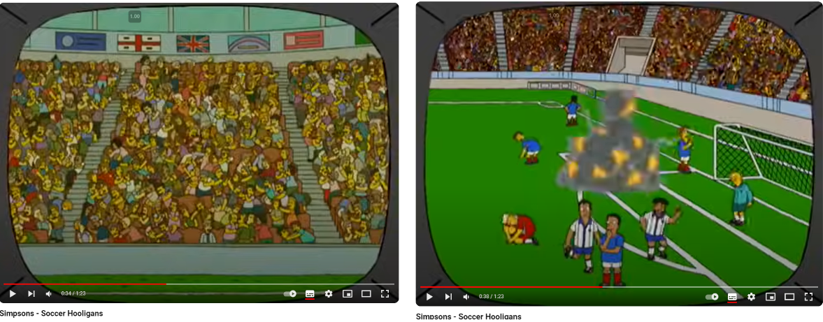 საფეხბურთო კლუბების მხარდამჭერთა კლუბების დროშები, ჩვეულებრივ, მატჩების დროს, ტრიბუნებზე ჩანს, სადაც მხარდამჭერები მათ გუნდისადმი ერთგულების გამოსავლენად და თანამოქალაქეებს შორის ერთიანობისა და ენთუზიაზმის შესაქმნელად იყენებენ. ოფიციალური საფეხბურთო კლუბის დროშებისგან განსხვავებით, საფეხბურთო კლუბების მხარდამჭერთა დროშები, როგორც წესი, იქმნება გულშემატკივართა ჯგუფების მიერ და ეს დროშები შეიძლება შეიცავდეს საყვარელ კლუბთან დაკავშირებულ ელემენტებს, როგორიცაა გუნდის ფერი, ლოგო, ისინი ასევე შეიძლება შეიცავდეს დამატებით სლოგანებს ან დევიზებს, რომლებიც ასევე შექმნილია თავად გულშემატკივრების მიერ. შესაბამისად, “სიმპსონების” ამ ფრაგმენტში არა საქართველოს დროშა, არამედ ინგლისის საფეხბურთო კლუბების მხარდამჭერთა დროშები არის წარმოდგენილი. ბუნებრივია, რომ ანიმაციაში დროშები ან სხვა კულტურული სიმბოლოები გამარტივებული ან სტილიზებული სახით არის წარმოდგენილი, ამიტომ “სიმპსონებში” წარმოდგენილ დროშაზე, თეთრ ფონზე ერთი წითელი ჯვრის გარდა სხვა სიმბოლოების ზუსტად გარჩევა შეუძლებელია. 2006 წელს მსოფლიო ჩემპიონატის დროს ინტერნეტში ფართოდ გავრცელდა ინგლისის საფეხბურთო კლუბების მხარდამჭერთა ფოტოები მათ დროშებთან ერთად, სადაც ვხედავთ ინგლისის დროშაზე (წითელი ჯვარი თეთრ ფონზე) დატანილ სხვადასხვა სლოგანსა და სიმბოლოს.
