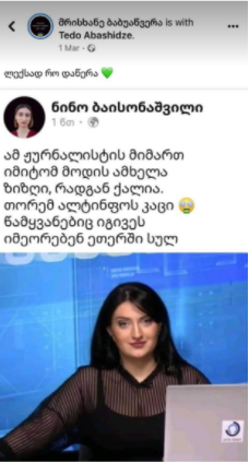 “ფემინას” დამფუძნებლის სახელით გავრცელებული პოსტი “ალტ-ინფოს” წამყვანის შესახებ გაყალბებულია. 1 მარტს ბაისონაშვილის პროფილზე მსგავსი შინაარსის პოსტი არ იძებნება.