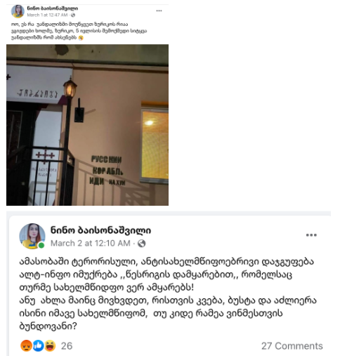 უფრო მეტიც, ბაისონაშვილს, როგორც 1 მარტს, ასევე შემდეგ დღეებში გამოქვეყნებული აქვს პოსტები, რომლითაც “ალტ-ინფოს” და მასთან დაკავშირებულ კონსერვატიულ მოძრაობას აკრიტიკებს.