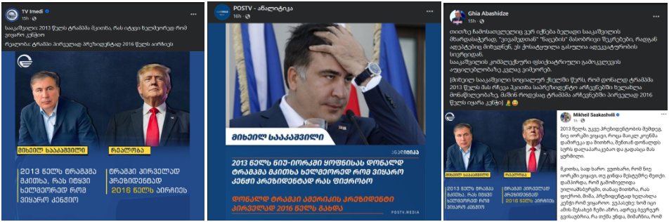 6 ნოემბერს პროსახელისუფლებო სარედაქციო პოლიტიკის მქონე ტელეკომპანია “იმედმა” და POSTV-იმ გამოაქვეყნეს საქართველოს ყოფილი პრეზიდენტის, მიხეილ სააკაშვილის ციტატა, რომლის მიხედვითაც 2013 წელს დონალდ ტრამპმა მას ჰკითხა, რას ფიქრობდა, პრეზიდენტობისთვის ხელმეორედ რომ ეყარა კენჭი. მედია ციტატას ურთავს კომენტარს, რომ ტრამპი პირველად პრეზიდენტად 2016 წელს აირჩიეს. “იმედის” საინფორმაციო ბარათი და იგივე მტკიცება ასევე გამოაქვეყნეს პროსახელისუფლებო ექსპერტმა, გია აბაშიძემ და სხვა ფეისბუქ-მომხმარებლებმა (1;2;3).