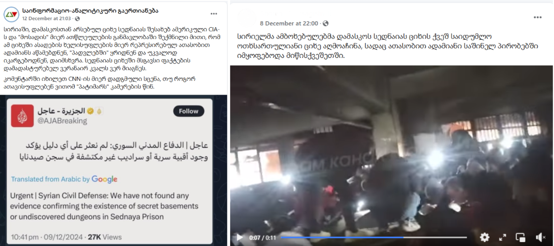 8-12 დეკემბერს სოციალურ ქსელ Threads-ზე და ფეისბუქზე სირიაში მდებარე სედნაიას ციხის შესახებ განსხვავებული შინაარსის ინფორმაცია გავრცელდა. ერთ-ერთი მტკიცების მიხედვით, “სირიელმა ამბოხებულებმა დამასკოს სედნაიას ციხის ქვეშ საიდუმლო ოთხსართულიანი ციხე აღმოაჩინა, სადაც ათასობით ადამიანი საშინელ პირობებში იმყოფებოდა მიწისქვეშეთში”. ფეისბუქ-ანგარიშმა “საინფორმაციო ანალიტიკური გაერთიანება” კი გამოაქვეყნა პოსტი, რომლის მიხედვითაც ციხეში ასადების ხელისუფლების მიერ რეპრესირებული ათასობით ადამიანის წამება, სარდაფებში ჩაყრა და უკვალოდ გაქრობა მითი აღმოჩნდა. მისი მტკიცებით “სედნაიას ციხეში მსგავსი ფაქტების დამადასტურებელ ვერანაირ კვალს ვერ მიაგნეს”. ანგარიში გავრცელებული ინფორმაციის დასტურად პოსტს ურთავს “ალ-ჯაზირას” მიერ სოციალურ ქსელ x-ში გამოქვეყნებული პოსტის ფოტოს, სადაც ვკითხულობთ, რომ სირიის სამოქალაქო თავდაცვის ორგანიზაციის განცხადებით, ციხეში ვერ აღმოაჩინეს საიდუმლო სარდაფებისა და მიწისქვეშა ციხის დამადასტურებელი მტკიცებულებები.