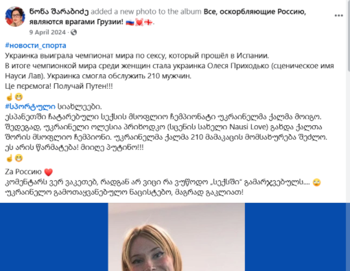 ფეისბუკ-ანგარიში ნონა შარაბიძე ანტიდასავლური შინაარსის დეზინფორმაციასა და კრემლისტურ ნარატივებს რეგულარულად ავრცელებს. მის მიერ გავრცელებული ყალბი ინფორმაცია “მითების დეტექტორს” არაერთხელ გადაუმოწმებია.
