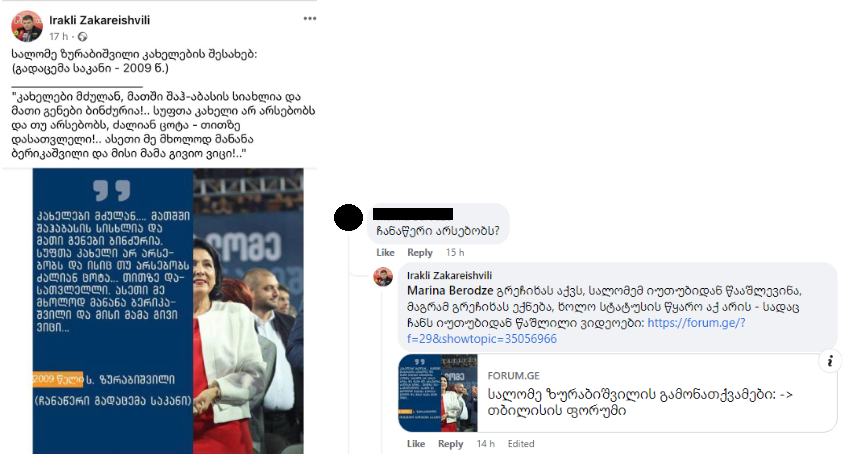 ირაკლი ზაქარეიშვილი პოსტის კომენტარებში ამტკიცებს, რომ გადაცემის ჩანაწერი Youtube-დან წაშლილია.
