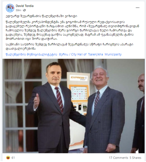 პოსტი, სავარაუდოდ, 2021 წლის დეკემბერში წალენჯიხა-ჯგალის დამაკავშირებელ საავტომობილო გზაზე საქართველოს ბანკის სწრაფი ჩარიცხვის აპარატის დადგმას უკავშირდება.