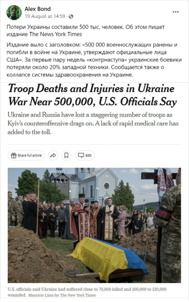 19 августа грузиноязычные и русскоязычные фейсбук-аккаунты опубликовали скриншот англоязычной статьи. Заголовок статьи: «Число погибших и раненых военных на войне в Украине составляет около 500 000». Согласно описанию к распространенным постам, западные издания, ведущие газеты мира, такие как The New York Times, The Guardian, Reuters, CBC и New York Post, пишут, что потери Украины равны примерно 500 000 человек, а по данным тех же газет, потери россиян составляют от 250 000 до 300 000 человек.