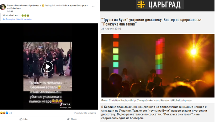 26 апреля фейсбук-пользователь Лариса Михайловна Артёмова опубликовала видео, на котором танцуют люди. Видео сопровождается русскоязычным описанием: «Трупы что лежали в Берлине встали 😊 изнасилованные и убитые украинки в пьяном угаре», что создает впечатление, что речь идет о находящихся в Берлине украинцах. В дополнение к этому пользователь «Кароса Ни» в посте отмечает, что в проукраинской акции участники исполняли роль трупов, после чего начали танцевать. То же самое видео 26 апреля опубликовало русскоязычное СМИ Царьград TV под заголовком: «Трупы из Бучи» устроили дискотеку». В тексте отмечается, что видео из Берлина распространил один из блогеров со следующим описанием: «Когда пять минут назад ты «изнасилованный труп в Буче», а сейчас ты просто радостный украинский алкаш, дорвавшийся до Европы».
