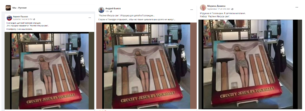 13-20 сентября фейсбук-аккаунты распространили фотографию на которой, согласно описанию, видно детскую игрушку распятия — «Распни Иисуса сам». (1,2,3,4,5,6,7,8,9,10,11,12,13,14,15,16) Согласно авторам этих постов, игрушку продают в Нидерландах. Часть фейсбук-аккаунтов также распространила видео (1,2,3,4) где священник Русской православной церкви заграницей (РПЦЗ) Александр Липин демонстрирует эту-же фотографию. Согласно Липину, игрушка продается в Нидерландах и «мир сошёл с ума, если такие игрушки продаются в магазинах». На фотографии видно, что в коробке вместе с фигурка Иисуса также помещены молоток, деревяшки для креста и гвоздики. Следует отметить, что фейсбук-аккаунт Кирилл Пашков опубликовал фотографию в группе «Мы — Русские» в качестве показателя с кем воюет россия.