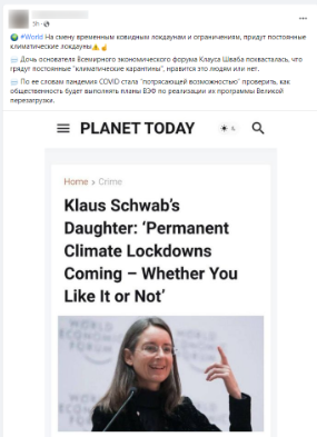 Скриншот, опубликованный в Facebook, взят из статьи новостного сайта The People’s Voice от 30 июля. Согласно статье, дочь Клауса Шваба похвасталась, что, нравится это людям или нет, постоянные «климатические локдауны» приближаются, и заявила, что пандемия коронавируса была «огромной возможностью» проверить, подчиняться ли люди планам, связанным с повесткой ВЭФ по «Великой перезагрузке».