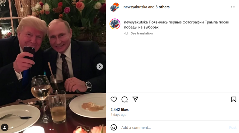 После победы Трампа на президентских выборах в Америке появились совместные фотографии Трампа и Путина, как будто они вместе отмечают результаты выборов. «Появились первые фотографии Трампа после победы на выборах», — пишет русскоязычная страница в Instagram newsyakutska и публикует фотографии. На фотографиях Трамп и Путин пьют вино. Эти же фотографии опубликовал русскоязычный Instagram-аккаунт etorussia_detka. Из комментариев к посту видно, что большинство пользователей воспринимают фотографии как настоящие.