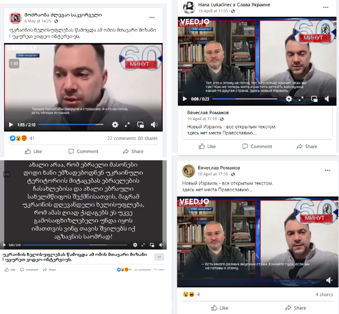 С 19 апреля русскоязычные и грузиноязычные аккаунты в Facebook распространяли отрывок из интервью с советником главы Офиса президента Украины Алексеем Арестовичем. Русскоязычные пользователи Facebook (1,2,3) распространяют видео с надписью «Новый Израиль – все открытым текстом. Здесь нет места Православию…». В видео фейсбук-страницы Движение дзлеваи саквирвели, которое было опубликовано 6 мая, встречается надпись, согласно которой, еврейские масоны уже давно готовятся к заселению евреев на украинские земли, и власти Украины уже открыто говорят об этом. После надписи использована фраза Арестовича: «Тот, кто к этому не готов, тот, кто сейчас кричит: «Как же так? Как же теперь жить и растить детей?», вам нужна какая-то другая страна. Здесь новый Израиль».