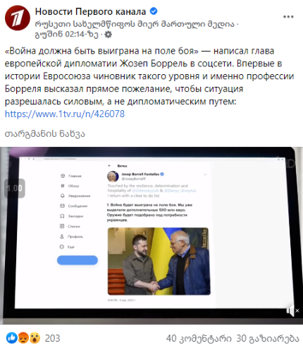 Российский Первый канал распространил только одну фразу Жозепа Борреля, и то в манипулятивном виде: «Война должна быть выиграна только на поле боя. Дополнительно выделим 500 млн евро. Поставки оружия будут осуществляться с учетом потребностей Украины».