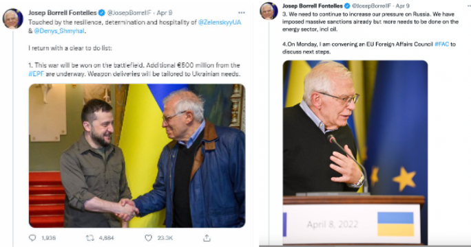 Данное заявление Жозеп Боррель сделал после того, как посетил Украину вместе с президентом Еврокомиссии Урсулой фон дер Ляйен и встретился с президентом Украины Владимиром Зеленским. Кроме того, он опубликовал еще несколько твитов, в которых говорил об ужесточении санкций в отношении России и помощи Украине.