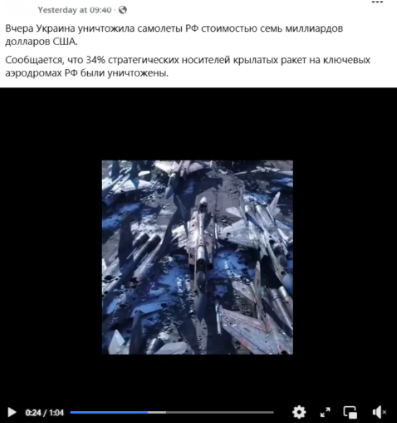 Видео, на котором, по утверждениям пользователей Facebook, показаны уничтоженные российские бомбардировщики, создано с помощью программного обеспечения. Эти кадры не распространялись ни одним авторитетным СМИ и не были включены в материалы, показанные официальными украинскими ведомствами. Кроме того, в видео присутствует множество неточностей, характерных для фотографий и видео, созданных Искусственным интеллектом. Сам тот факт, что Украина уничтожала самолеты на российских военных базах, является правдой.