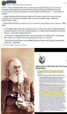2 октября в Facebook распространилось видео о предсказании генерала американской Конфедерации Альберта Пайка по поводу войн. Согласно видео, Пайк был верховным лидером масонов и сатаной, одержимым оккультизмом. В видео также рассказывается о письме, которое Пайк якобы написал итальянскому политику Джузеппе Мадзини и в котором предсказал три мировые войны. Согласно письму, упомянутому в видео, Пайк предсказал, что: